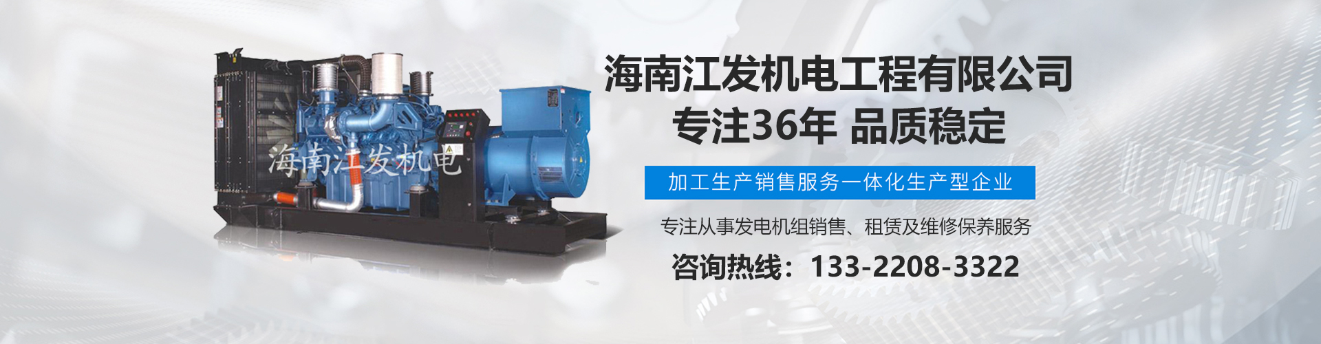 海南江發機電工程有限公司是海南經營進口、國產柴油發電機組、是海南較早、較大的銷售、租賃服務及維修保養專業機電公司。從1985年開始,公司勵精圖治、銳意進取、不斷創新,不僅在海南機電行業領域中具有先進技術、完美管理、誠信服務,高超的產品質量和性能,而且還有合理的產品性能價格比,令客戶滿意以及完善的支持保障。 在客戶心目中,江發公司不僅具有最好的企業信譽,還是客戶最信賴的誠信單位,而且會帶給客戶永遠的光明和豐厚回報。